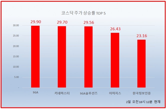 1위 SGA 882원 ( 29.9% ), 2위 키네마스터 17250원 ( 29.7% ), 3위 SGA솔루션즈 1315원 ( 29.56% ), 4위 이미지스 2870원 ( 26.43% ), 5위 한국정보인증 10900원 ( 23.16% ), 6위 솔본 5490원 ( 19.87% ), 7위 한국정보통신 10400원 ( 17.65% ), 8위 한국전자인증 8570원 ( 17.88% ), 9위 라온시큐어 4520원 ( 14.43% ), 10위 멜파스 2255원 ( 14.18% )