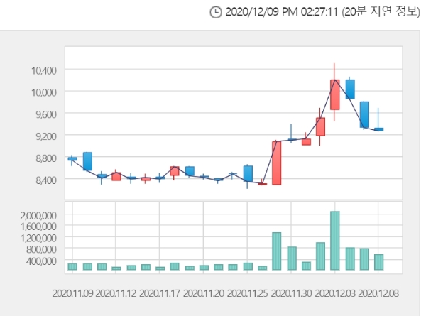 이미지 확대보기9일 한국거래소에 따르면 유가증권시장에서 코스모화학 주가는 이날 오후 2시 5분 현재 전거래일 대비 29.59% 오른 1만2000원에 거래되고 있다.