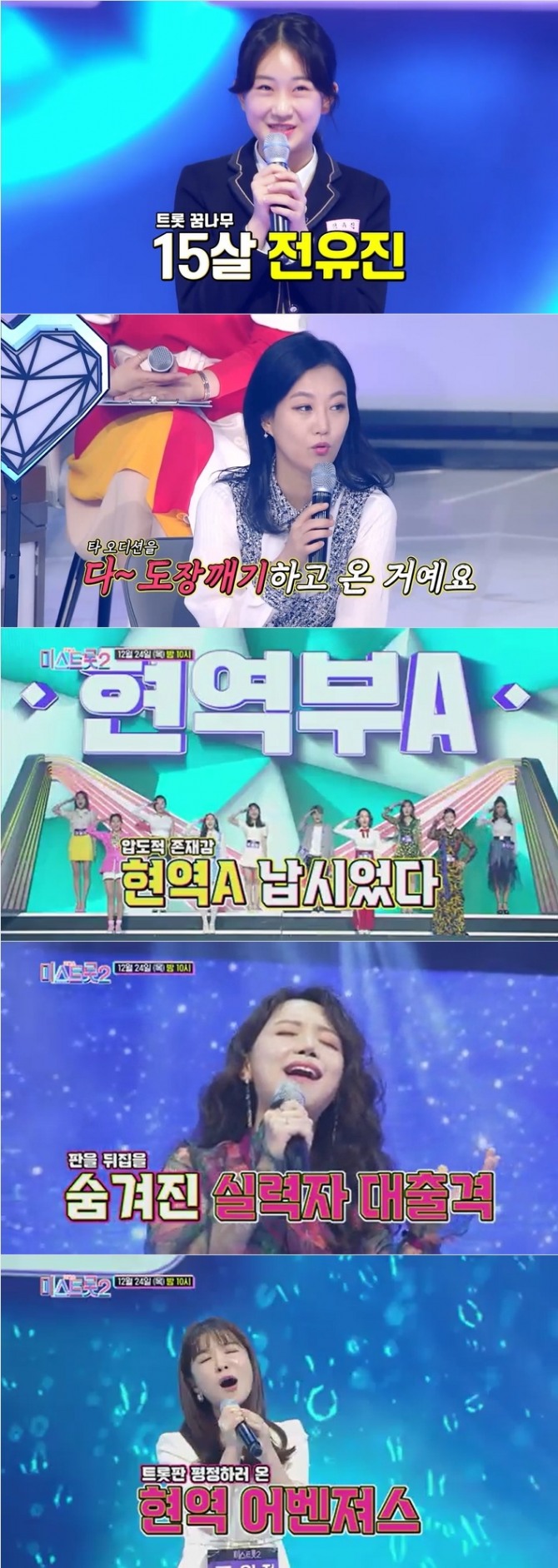 이미지 확대보기24일 방송되는 TV조선 예능 프로그램 '내일은 미스트롯2'(이하 '미스트롯2') 2회에는 송가인, 임영웅 등 전 시즌 우승자 뿐 아니라 TOP 순위권 내 참가자를 무수히 배출시킨 전통 강호 부서 '현역부 A조'가 전격 출격, 불꽃 튀는 경연을 펼친다.