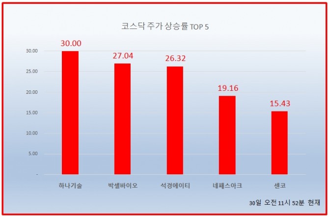 1위 하나기술 137800원 ( 30% ), 2위 박셀바이오 163500원 ( 27.04% ), 3위 석경에이티 36950원 ( 26.32% ), 4위 네패스아크 53800원 ( 19.16% ), 5위 센코 26550원 ( 15.43% ), 6위 엔젠바이오 31450원 ( 19.35% ), 7위 우리산업 23950원 ( 21.27% ), 8위#네패스 41000원 ( 17.14% ), 9위 지놈앤컴퍼니 83100원 ( 17.21% ), 10위 케이엔더블유 6420원 ( 7% )