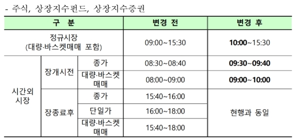 개장식 진행으로 당일 정규시장 매매거래는 평소보다 1시간 늦은 오전 10시에 시작하며 종료시각은 현행(오후 3시 30분)과 동일하다.