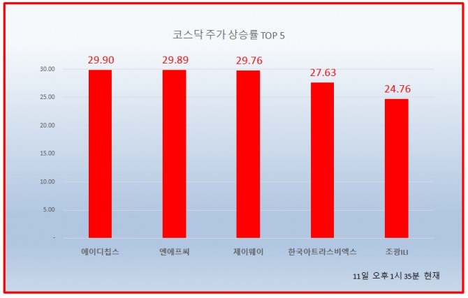 이미지 확대보기이날 오후 1시 35분 현재 코스닥 상승률 상위 50개 종목은 다음과 같다.