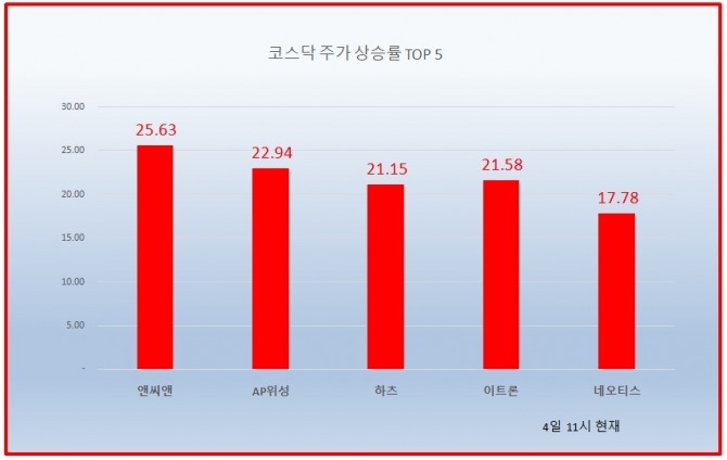 이미지 확대보기4일 주식시장에서 앤씨앤, AP위성, 하츠, 이트론 등이 20% 넘는 주가 상승률을 기록하며 급등하고 있다.