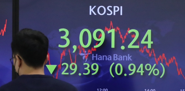 이미지 확대보기이날 한국거래소에 따르면 코스피는 전거래일(5일) 대비 0.94%(29.39포인트) 내린 3091.24를 마쳤다. 코스피는 전장보다 0.22%(7.00포인트) 내린 3113.63에서 출발했다. 지난 5일 종가 기준 3100선을 회복한 지 1거래일 만에 다시 3100선을 내줬다.