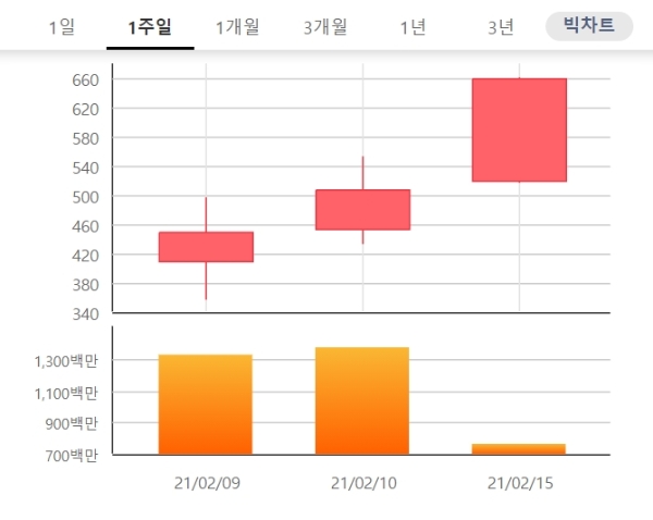 이아이디 주가는 종가 기준으로 4일 348원에서 15일 600원으로 두 배 가까이 뛰었다.
