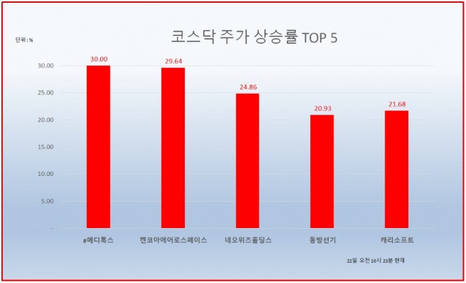 1위#메디톡스 197600원 ( 30% ), 2위 켄코아에어로스페이스 16400원 ( 29.64% ), 3위 네오위즈홀딩스 32900원 ( 24.86% ), 4위 동방선기 2340원 ( 20.93% ), 5위 캐리소프트 6790원 ( 21.68% ), 6위 다날 8650원 ( 17.69% ), 7위 센트럴바이오 2160원 ( 16.76% ), 8위 골든센츄리 417원 ( 17.46% ), 9위 AP위성 22050원 ( 12.79% ), 10위 위니아딤채 3140원 ( 13.77% )