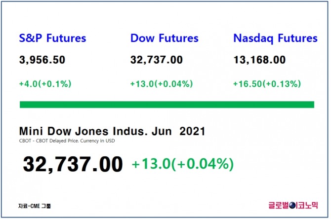 스탠더드 앤드 푸어스(S&P) 500 지수 선물은 0.1%(4포인트) 상승한 3956.5에 거래되고 있고, 나스닥 100 선물은 0.13%(16.5포인트)상승한 1만3168에 거래되고 있다.