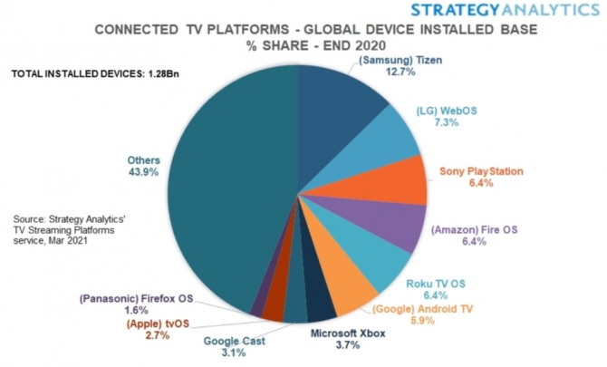 ‘소니 플레이스테이션’과 아미존의 ‘파이어OS(Fier OS)’, 로쿠OS(ROKU OS)가 각각 6.4%의 점유율을 기록했다. 뒤를 이어 구글의 안드로이드 TV는 5.9%, 마이크로소프트 엑스박스(Xbox)는 3.7%로 집계됐다.