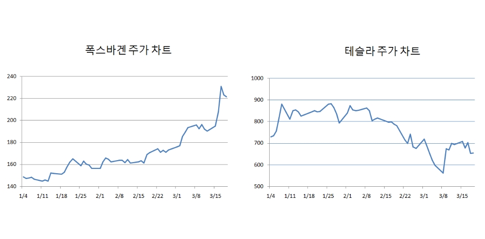 이미지 확대보기독일 폭스바겐그룹은 연초 대비 49% 상승한 반면, 테슬라는 10% 가까이 하락해 대조를 보이고 있다.