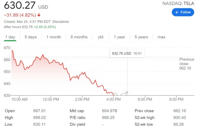 이미지 확대보기파파 머스크가 트윗으로 "비트코인 자동차 결제" 발언을 한 후 테슬라 주가는 오히려 떨어졌다.