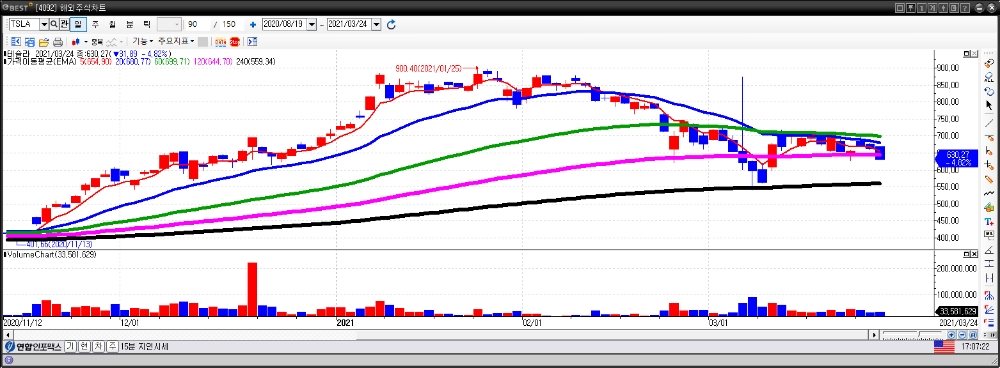24일(현지 시각) 뉴욕증시에서 전기차 관련주들이 상대적으로 큰 폭으로 떨어졌다. 대장주 테슬라가 비트코인으로 테슬라를 살 수 있다는 파격에도 4.82% 하락하며 630달러대를 간신히 지켰다. 샤오펑, 리샹, 니오는 각각 15.08%, 13.20%, 10.25% 폭락했다.