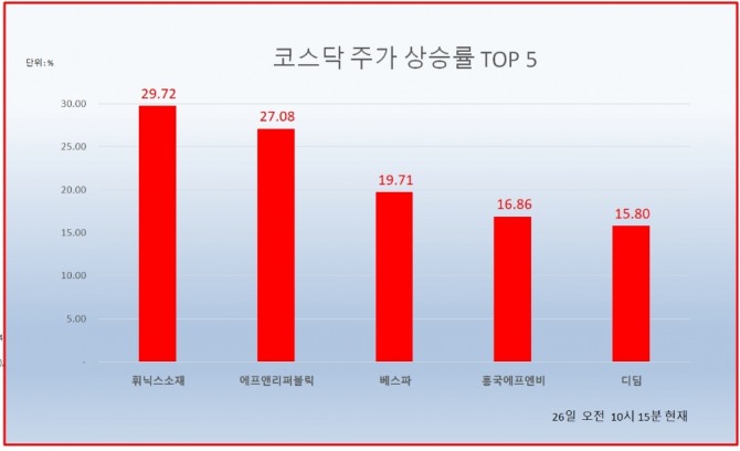 1위 휘닉스소재 1100원 ( 29.72% ), 2위 에프앤리퍼블릭 366원 ( 27.08% ), 3위 베스파 28850원 ( 19.71% ), 4위 흥국에프엔비 5440원 ( 16.86% ), 5위 디딤 2345원 ( 15.8% ), 6위 자이언트스텝 37250원 ( 13.74% ), 7위 데브시스터즈 151200원 ( 13.68% ), 8위 소리바다 324원 ( 12.89% ), 9위 바이오로그디바이스 1925원 ( 12.57% ), 10위 바이넥스 19700원 ( 10.06% )