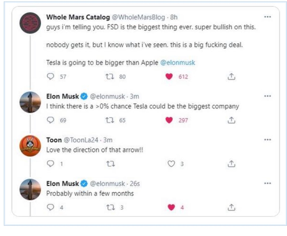 이 테슬라 팬은 현재 베타테스트 중인 테슬라의 완전자율주행(FSD) 시스템 덕분에 테슬라가 애플을 제치고 세계 최대 기업이 될 것이라고 주장했다.