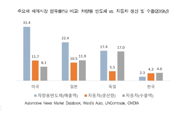 세 국가 모두 차량용 반도체 매출액 기준 점유율이 자동차 생산·수출 점유율과 비슷하거나 크게는 3배 이상 높았다.
