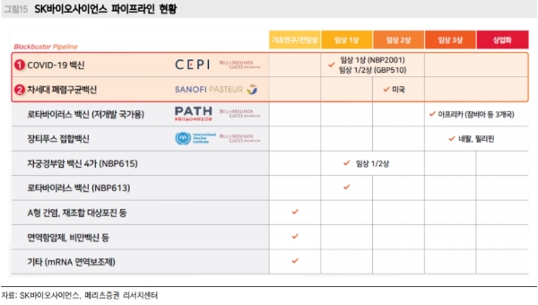 SK바이오사이언스는 빌게이츠재단과 전염병대비혁신연합(CEPI)의 지원으로 코로나19 백신인 GBP510뿐만 아니라 재조합 코로나19 백신 후보물질인 NBP2001을 자체 개발 중이다. GBP510은 지난해 12월 31일 식품의약품안전처에서 임상 1•2상을, NBP2001는 임상 1상을 승인받으며 코로나19백신기대가 현실로 달라질 가능성이 높다.