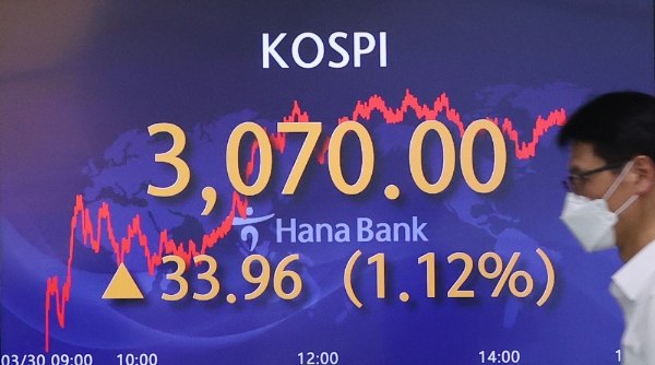 이미지 확대보기이날 한국거래소에 따르면 코스피는 전날 대비 1.12%(33.96포인트) 오른 3070.00에 거래를 마쳤다.