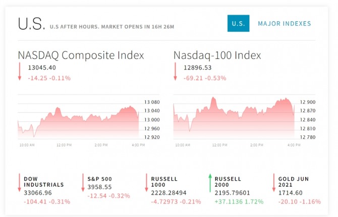 이미지 확대보기31일 뉴욕증시에 따르면 뉴욕증권거래소(NYSE)에서 다우존스 30 산업평균지수는 104.41포인트(0.31%) 하락한 33,066.96으로 마쳤다. 스탠더드앤드푸어스(S&P) 500 지수는 12.54포인트(0.32%) 떨어진 3,958.55로, 또 기술주 의 나스닥 지수는 14.25포인트(0.11%) 밀린 13,045.39로 장을 마감했다. 나스닥 기술주지수는테슬라 효과로 한때 상승했으나 막판에 또 밀렸다.