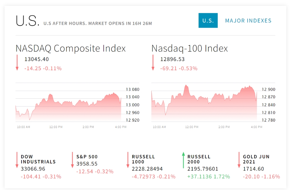 31일 뉴욕증시에 따르면 뉴욕증권거래소(NYSE)에서 다우존스 30 산업평균지수는 104.41포인트(0.31%) 하락한 33,066.96으로 마쳤다. 스탠더드앤드푸어스(S&P) 500 지수는 12.54포인트(0.32%) 떨어진 3,958.55로, 또 기술주 의 나스닥 지수는 14.25포인트(0.11%) 밀린 13,045.39로 장을 마감했다. 나스닥 기술주지수는테슬라 효과로 한때 상승했으나 막판에 또 밀렸다.