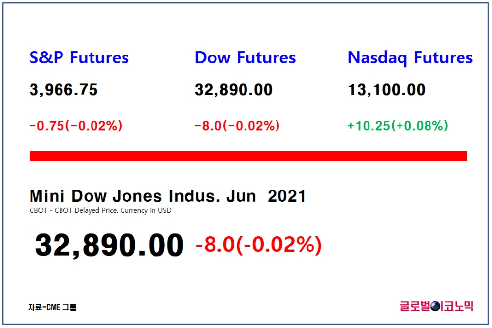 스탠더드 앤드 푸어스(S&P) 500 지수 선물은 0.02%(0.75포인트) 하락한 3966.75에 거래되고 있고, 나스닥 100 선물은 0.08%(10.25포인트)상승한 1만3100에 거래되고 있다.