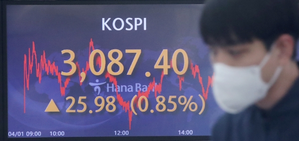 한국거래소에 따르면 코스피는 전날 대비 0.85%(25.98포인트) 오른 3087.40에 거래를 마쳤다.