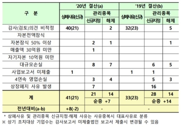 거래소는 또 12월말 결산 코스닥 상장기업 1441개의 사업보고서를 심사한 결과, 지스마트글로벌 등 41개가 감사 범위 한정이나 의견거절 등 비적정 감사의견을 받아 상장폐지 사유가 발생했다고 밝혔다.