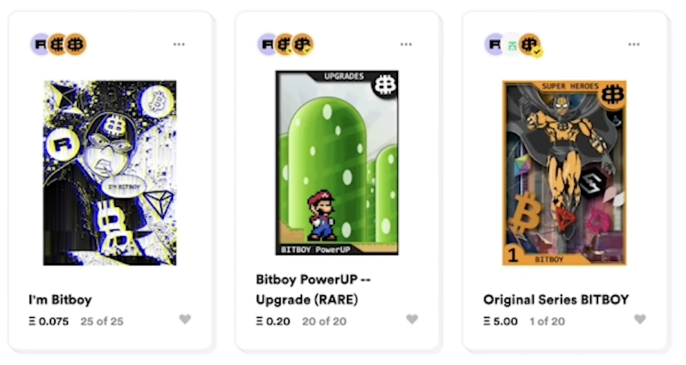 사진에서 보이는 3가지 NFT 매물은 라리블(Rarible)이라는 NFT 거래소에서 거래가 이뤄진 것으로 가장 오른쪽이 프로필 사진에 인증마크(노란 동그라미 속 체크표시)가 제대로 표시된 정상적인 매물이고 가장 왼쪽은 인증마크가 아예 없어 사기 매물이다.