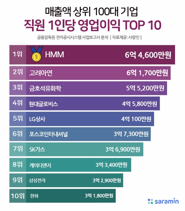 직원들이 장사 가장 잘한 기업은…HMM 1인당 영업이익 1위