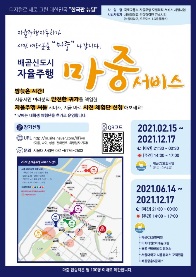 “마중 서비스는 시흥에서 무료로 자율주행차를 타볼 수 있는 절호의 기회이며, 자율차마중서비스 어플이나 링크 또는 포스터에 있는 QR코드를 통해 간단하게 신청할 수 있다.