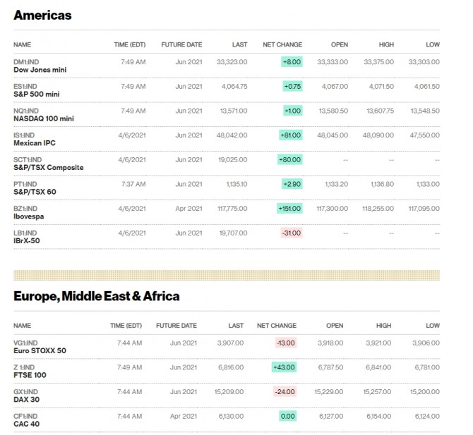 전날 마감한 뉴욕증시는 연이은 사상 최고치 경신에 따른 고점 부담에 소폭 하락했다. 뉴욕증권거래소(NYSE)에서 다우존스 30 산업평균지수는 96.95포인트(0.29%) 하락한 33,430.24에 마감했다. S&P500 지수는 3.97포인트(0.10%) 떨어진 4,073.94에, 기술주 의 나스닥 지수는 7.21포인트(0.05%) 하락한 13,698.38에 마쳤다. 다