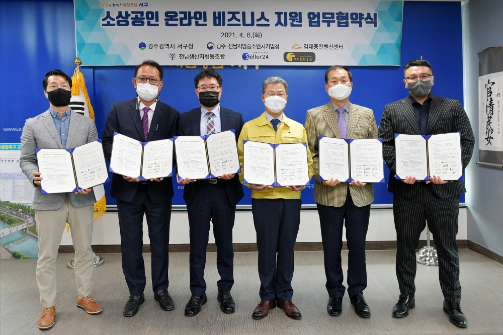 광주·전남지방중소벤처기업청(청장 장대교)는 지난 6일 광주광역시 서구(구청장 서대석), 김대중컨벤션센터(사장 정종태), 전남생산자협동조합(이하 전남생협, 이사장 윤준웅), 셀러24(대표이사 이기영), ㈜인필(대표이사 김철현)과 광주 서구지역 ‘소상공인의 온라인시장 진출 활성화’를 위한 업무협약을 체결했다고 밝혔다.