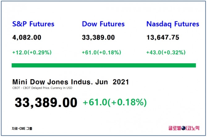 스탠더드 앤드 푸어스(S&P) 500 지수 선물은 0.29%(12포인트) 상승한 4082에 거래되고 있고, 나스닥 100 선물도 0.32%(43포인트)상승한 1만3647.75에 거래되고 있다.