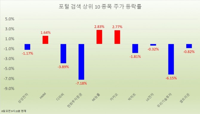 이들 종목 외에도 오전 9시 22분 현재 포털사가 집계하는 검색량 기준 상위 20개 종목의 현황은 다음과 같다.
