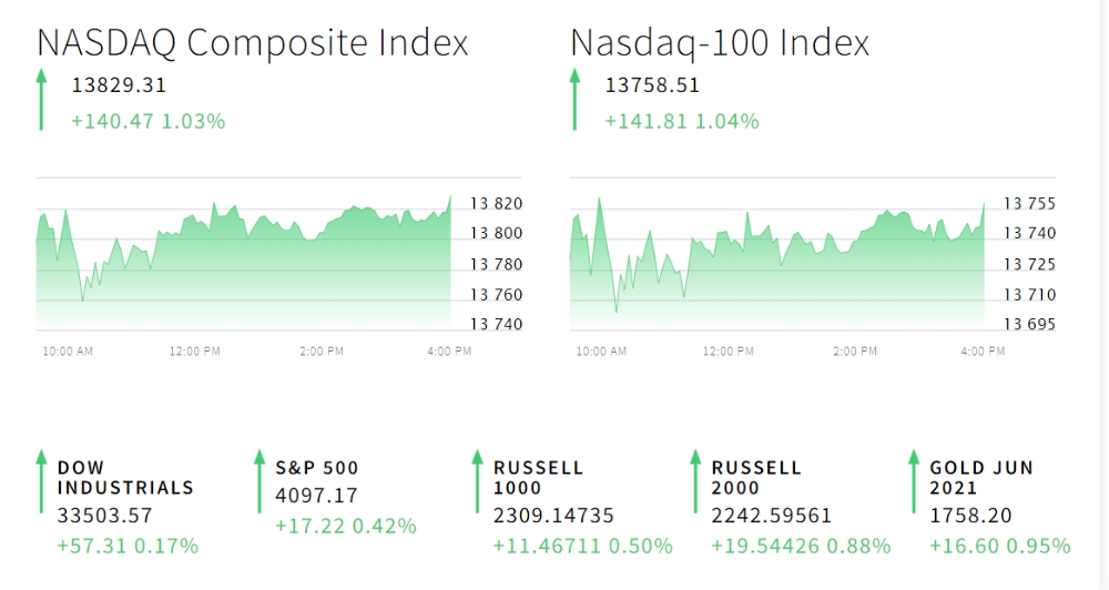 이미지 확대보기9일 뉴욕증시에 따르면 나스닥 다우지수 등은 기술주들의 강세에 힘입어 오름세로 마감했다.뉴욕증권거래소(NYSE)에서 다우존스 30 산업평균지수는 전장보다 57.31포인트(0.17%) 상승한 33,503.57로 마쳤다. 스탠더드앤드푸어스(S&P) 500 지수는 전장보다 17.22포인트(0.42%) 오른 4,097.17로 끝났다.기술주의 나스닥지수는 140.47포인트(1.03%) 뛴 13,829.31로 장을 마감했다. 특히 S&P500지수는 종가 기준 사상 최고치로 마감했다. 이날 뉴욕증시 주가는 애플과 마이크로소프트 등이 1% 이상 오르며 상승을 주도했다.