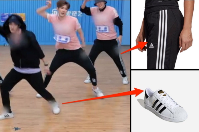중국 오디션 프로그램 출연자들이 착용한 옷과 신발에서 아디아스의 로고가 흐릿하게 처리돼 있다. 사진=비즈니스 인사이더