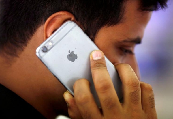 한 인도 남성이 인도 뉴델리의 모바일스토어에서 애플 아이폰으로 전화하는 모습. 사진=로이터