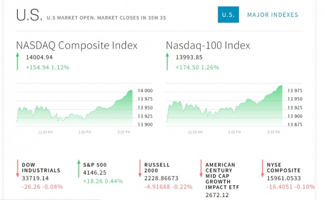 이미지 확대보기14일 뉴욕 증시에 따르면 뉴욕증시는 존슨앤드존슨(J&J)이 개발한 코로나19 백신에 대한 사용 중단 권고가 내려졌다는 소식에 혼조세로 출발했으나 시간이 오르면서 오르고 있다. 뉴욕증권거래소(NYSE)에서 다우존스 30 산업평균지수는 소폭 하락세를 보이고 있으나 스탠더드앤드푸어스(S&P) 500 지수와 기술주의 나스닥지수는 크게 오르고 있다.