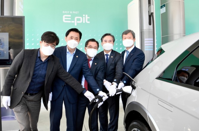 이미지 확대보기현대차그룹은 14일 서해안고속도로 화성휴게소(목포 방향)에서 전기차 초고속 충전소 'E-핏(E-pit)' 개소식을 개최하고 15일부터 전국 주요 고속도로 휴게소에서 운영을 시작한다고 밝혔다.