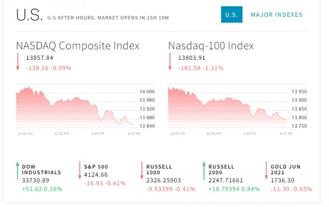 이날 뉴욕증권거래소(NYSE)에서 다우존스30 산업평균지수는 전장보다 53.62포인트(0.16%) 오른 33,730.89에 거래를 마쳤다. 스탠더드앤드푸어스(S&P)500지수는 전장보다 16.93포인트(0.41%) 하락한 4,124.66에, 또 기술주 중심의 나스닥 지수는 138.26포인트(0.99%) 떨어진 13,857.84에 장을 마쳤다. 나스닥 기술주는 하락했다. 테슬라 넷플릭스 페이스북 애플 MS등이 일제히 떨어졌다.