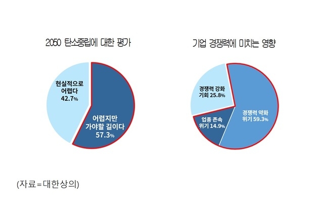 탄소중립이 기업 경쟁력에 미치는 영향에 대해서는 '경쟁력 약화 위기' 59.3%, '업종 존속 위기' 14.9%라고 밝혔다.