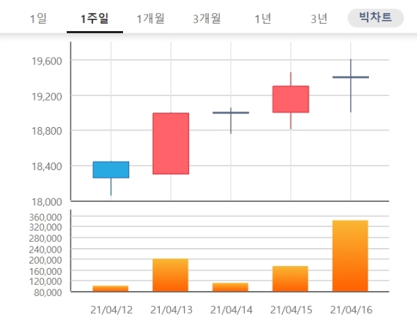 이날 주가가 급등하며 장중 2만2000원을 돌파했다.