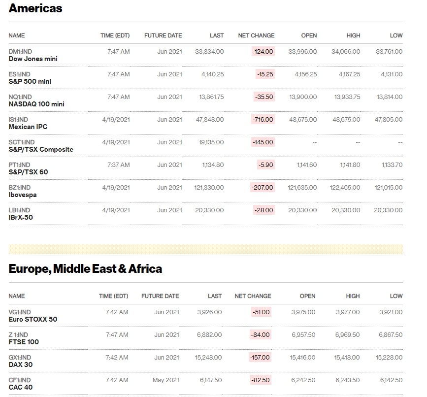 이미지 확대보기20일 뉴욕증시에 따르면 뉴욕증권거래소(NYSE)에서 다우존스30 산업평균지수는 123.04포인트(0.36%) 하락한 34,077.63으로 마쳤다. 스탠더드앤드푸어스(S&P)500지수는 전장보다 22.21포인트(0.53%) 밀린 4,163.26에 끝났다. 기술주 중심의 나스닥지수는 137.58포인트(0.98%) 떨어진 13,914.77로 마쳤다. 지난 주 사상 최고치를 경신했던 다우지수와 S&P500지수는 고점 부담에 하락했다. 나스닥 지수도 이전 고점을 돌파하지 못했다. 지난주 경제 지표 강세와 기업들의 실적 호조로 S&P500지수와 다우지수는 각각 1.38%, 1.18% 올랐다. 두 지수는 모두 4주 연속 올랐다. 나스닥지수는 3주 연속 올라 차익실현 부담이 커진 상황이었다. 테슬라 주가는 테슬라 차량 사고에 두 명의 남성이 사망했다는 소식에 크게 떨어졌다.