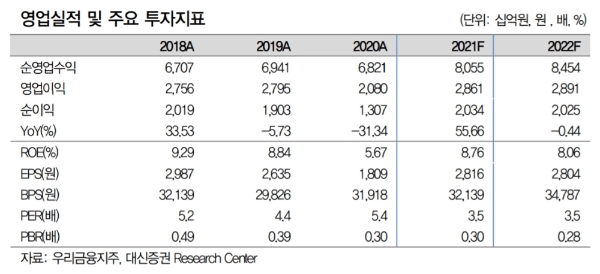 우리금융지주 영업실적 추정치, 자료=대신증권