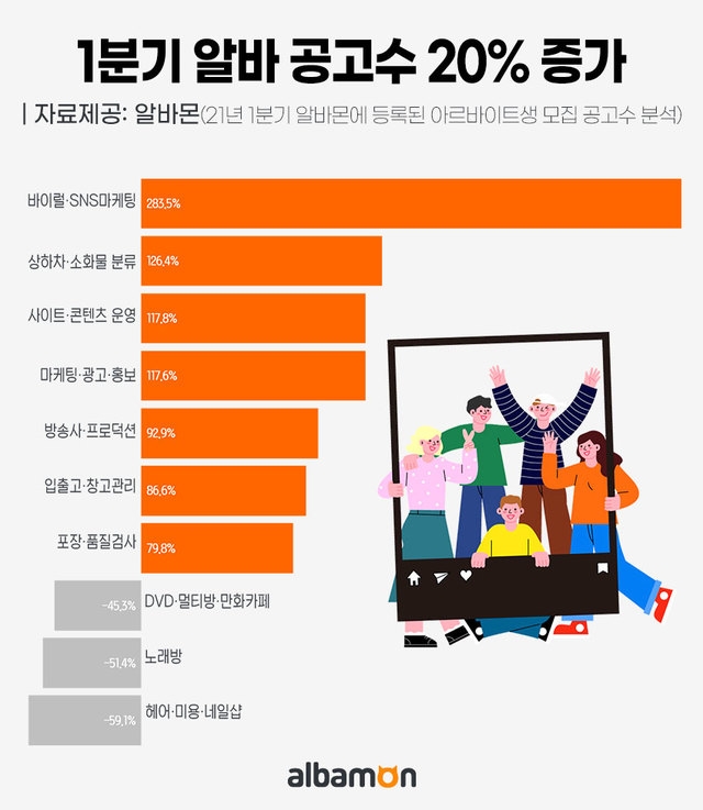 아르바이트 포털사이트 알바몬이 24일 자사 사이트에 등록된 아르바이트 공고 빅데이터를 분석한 결과, 올해 1분기 공고 건수가 지난해보다 19.8% 늘었다.