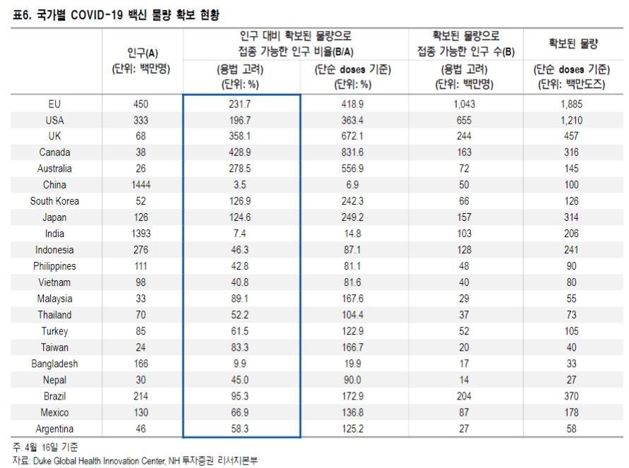 다만 아스트라제네카 백신은 저소득 및 이머징 국가에 공급계약이 가장 많이 돼있고 가격이 저렴하여 수요는 계속될 것으로 보인다.