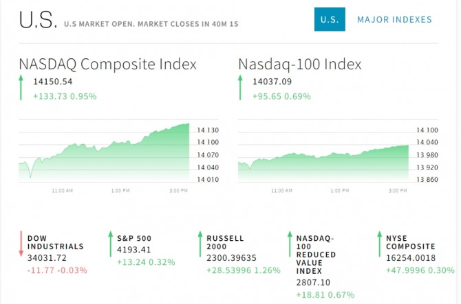 미국 뉴욕증시에서 나스닥 기술주가 크게 오르고 있다. 테슬라와 아마존 애플 MS등의 실적이 크게 호전됐다는 발표에 힘입이 나스닥이 오르고 있다. 바이든 자본이득세가 변수이다. 비트코인 가상화폐도 조금씩 회복되고 있다.