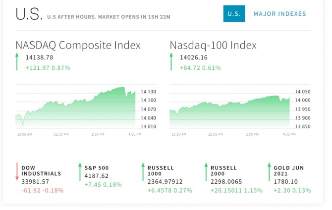 이미지 확대보기27일 뉴욕증시에 따르면 뉴욕증권거래소(NYSE)에서 다우존스30산업평균지수는 전장보다 61.92포인트(0.18%) 하락한 33,981.57로 마감했다. 또 스탠더드앤드푸어스(S&P)500지수는 7.45포인트(0.18%) 상승한 4,187.62를, 기술주의 나스닥지수는 121.97포인트(0.87%) 오른 14,138.78을 나타냈다. 특히 나스닥 지수는 기술 기업들의 실적 기대에 2월 12일 이후 또 사상 최고치로 마감했다.
