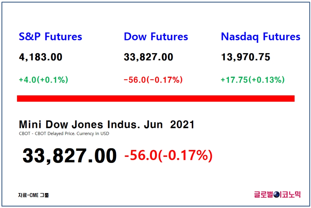 스탠더드 앤드 푸어스(S&P) 500 지수 선물은 0.1%(4포인트) 상승한 4183에 거래되고 있고, 나스닥 100 선물은 0.13%(17.75포인트)상승한 1만3970.75에 거래되고 있다.