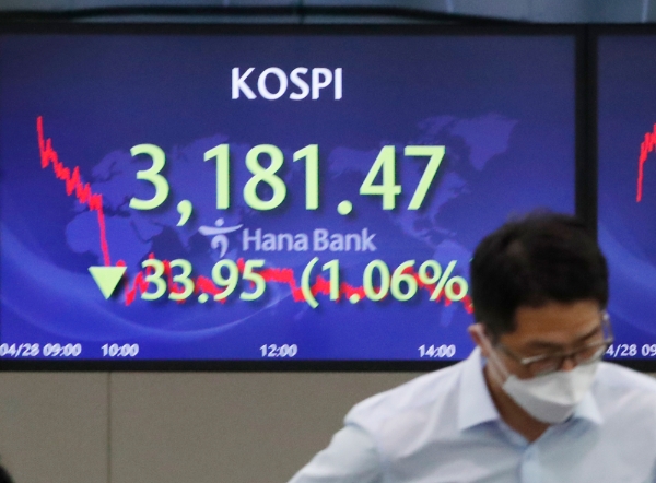 이미지 확대보기28일 한국거래소에 따르면 코스피는 전날 대비 1.06%(33.95포인트) 내린 3181.47에 거래를 마쳤다. 지수는 전장보다 0.06%(1.79포인트) 오른 3217.21에서 출발해 하락전환했다.