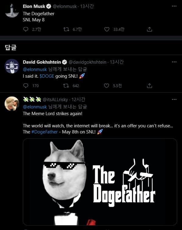 이미지 확대보기미국 경제전문매체 CNBC는 머스크가 "도지파더(Dodgefather) SNL 5월 8일"이라는 트윗을 올린 뒤 도지코인 가격이 24시간 새 20% 급등하며 32센트(0.32달러)로 상승했다고 28일(현지 시각) 보도했다.