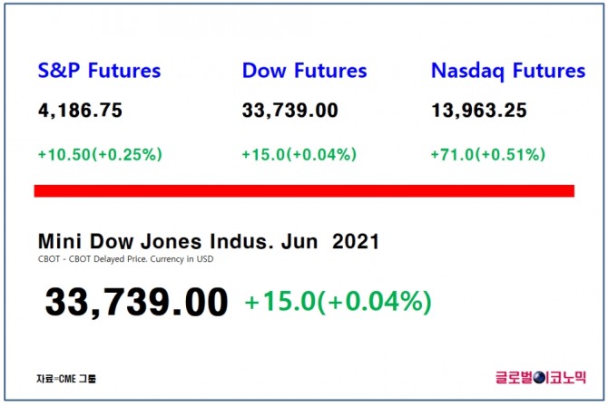 스탠더드 앤드 푸어스(S&P) 500 지수 선물은 0.25%(10.5포인트) 상승한 4186.75에 거래되고 있고, 나스닥 100 선물도 0.51%(71포인트)상승한 1만3963.25에 거래되고 있다.